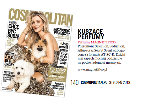 Wyjątkowa aura jaką kreują perfumy MAGNETIFICO - power of pheromones - została zauważona i wyróżniona przez redaktorów magazynu COMOSPOLITAN. Więcej o tym przeczytasz w styczniowym wydaniu (1/2018) -