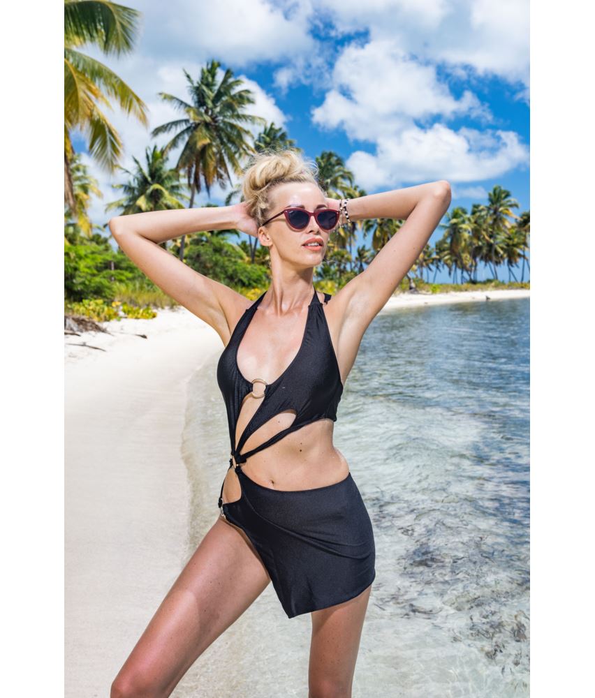 Odważna a zarazem niesamowicie seksowna plażowa sukienka w kolorze czarnym, z asymetrycznymi wycięciami połączona ozdobnymi kółkami, która nieziemsko prezentuje się na kobiecej sylwetce. Nada seksapilu a zarazem wygody na plaży.