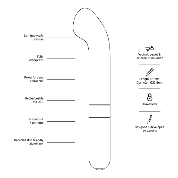 Liebe to model mocno skoncentrowany na punkcie G. Nie jest zbyt duży, nie jest zbyt gruby – jego siłą jest mocno wibrująca końcówka, która jest tak wyprofilowana, by jak najlepiej przylegać do punktu G. Wystarczy włożyć wibrator do środka, nakierować główkę na górną ściankę pochwy i udać się na poszukiwanie punktu G. Wibrator pracuje w trybie zwanym rumbly, czyli wibracje są głębokie, jakby dudniące, a właśnie taką stymulację punkt G lubi najbardziej. Zresztą nie tylko on – kształt wibratora pozwala stosować go również jako zgrabny masażer łechtaczki.