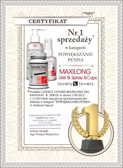 Produkty LOVELY LOVERS MAXILONG GEL 150ml & SPRAY 50ml są najchętniej wybieranymi preparatami w swojej kategorii. Nie byłoby to możliwe, gdyby nie setki zadowolonych klientów. Dlatego seria LL MAXILONG została oznaczona certyfikatem "Nr 1 sprzedaży" w kategorii: POWIĘKSZANIE PENISA. Zasłużyły na to miano, dzięki najwyższej sprzedaży oraz pochlebnym opiniom kupujących. Dziękujemy!