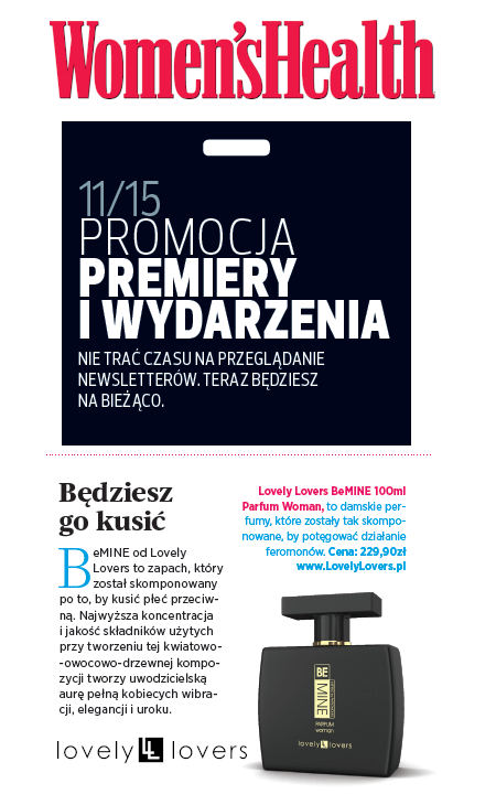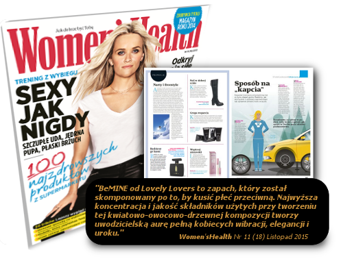 Działanie perfum z feromonami zapachowymi BEMINE zostało docenione przez redakcję magazynu Women'sHealth. Przyznane wyróżnienie oraz pełną recenzję perfum możesz zobaczyć w listopadowym numerze 11/2015. Artykuł "Będziesz go kusić" ze 144str. zobaczysz klikając w poniższy obrazek lub link: