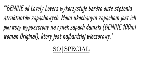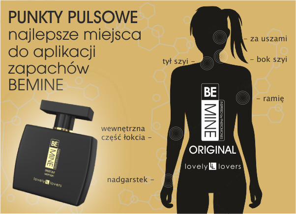 Oryginalny kobiecy bukiet zapachowy powstał we Francji dzięki doświadczeniu marki LOVELY LOVERS. W efekcie badań i testów nad 237 atraktantami zapachowymi w różnych proporcjach. Wyselekcjonowano te, które w największym stopniu oddziałują na płeć przeciwną wydobywając maksimum ponętności z kompleksu olejków zapachowych. Tak powstała baza formuły I-L-Molecules (INTENSE LOVE MOLECULES). Dopracowano ją tak, aby synergicznie łączyła się z zapachem kobiecej skóry tworząc niepowtarzalną całość. Najwyższa koncentracja i jakość składników użytych przy tworzeniu tej kwiatowo-owocowo-drzewnej kompozycji BEMINE Original pozwala stworzyć uwodzicielską aurę pełną kobiecych wibracji, elegancji i uroku.