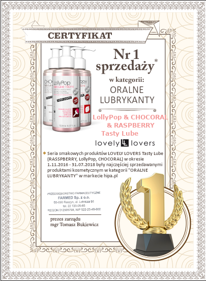 Produkty LOVELY LOVERS ze smakowej serii Tasty Lube (RASPBERRY, LollyPop, CHOCORAL) 150ml są najchętniej wybieranymi żelami oralnymi w swojej kategorii. Nie byłoby to możliwe, gdyby nie setki zadowolonych klientów. Dlatego seria Tasty Lube została oznaczona certyfikatem "Nr 1 sprzedaży" w kategorii: ORALNE LUBRYKANTY. Te 3 żele zasłużyły na to miano, dzięki najwyższej sprzedaży oraz pochlebnym opiniom kupujących. Dziękujemy!