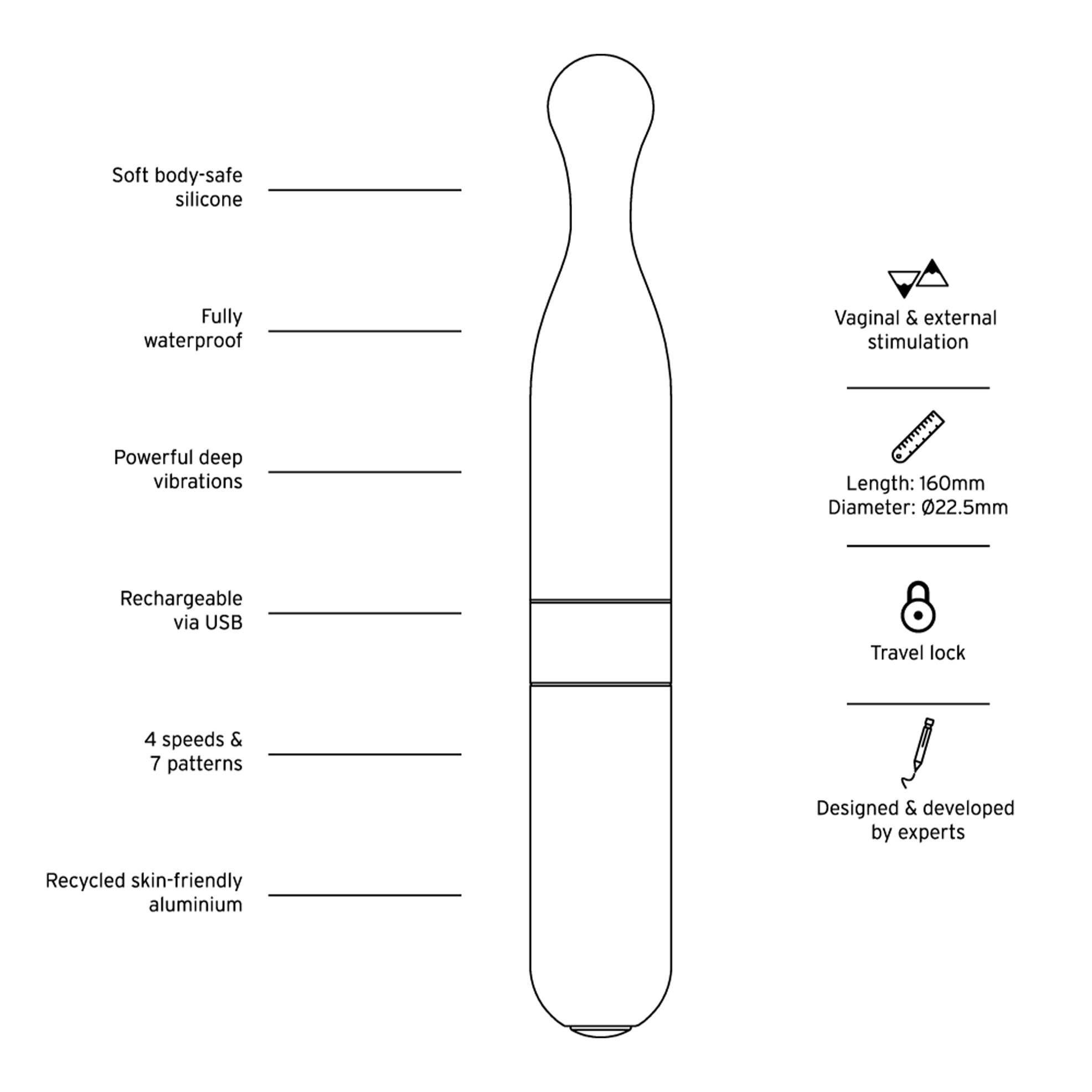 Czy lubisz precyzyjną stymulację łechtaczki? W takim razie ta mała kula z końcówką kulkową jest zabawką dla Ciebie. W dni, kiedy chcesz spędzać godziny na przyjemności, niższe ustawienia oferują dudniące wibracje, które pozwalają budować powoli, ale w dni, kiedy liczy się czas, połączenie końcówki długopisu i wyższych ustawień zapewnia brzęczące wibracje to przechodzi od razu do sedna.