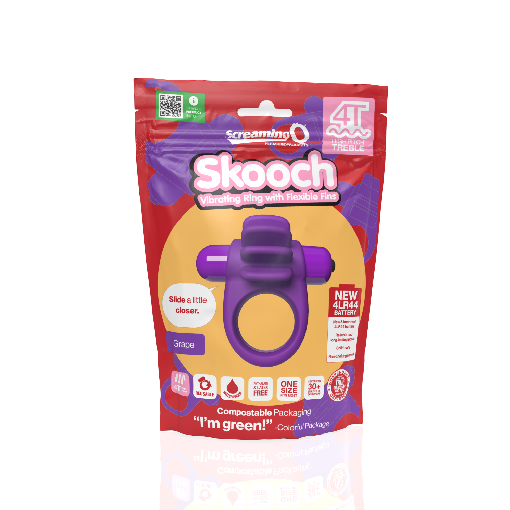 4T Skooch to wibrujący pierścień na penisa z wypustkami przypominającymi płetwy, które drżą dzięki 6 funkcjom łaskoczących i drażniących wibracji 4T Bullet. Wykonany z mocnego, a zarazem elastycznego prawdziwego silikonu, 4T Skooch pozwala użytkownikom rozcierać, zamiatać i pocierać swoje żebra, wysyłając przenikliwe wibracje bezpośrednio do łechtaczki, zapewniając jednocześnie użytkownikowi uczucie erekcji.