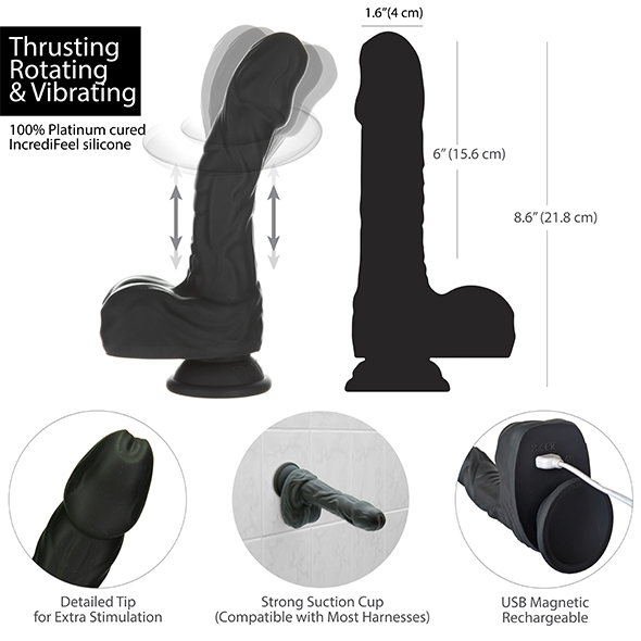 Ten dong ma do zaoferowania różnorodne ruchy od łagodnych do dzikich pchnięć, wibracji i obracania się i nie przypomina niczego, co widziałeś wcześniej. Dzięki dołączonemu bezprzewodowemu pilotowi możesz wykonywać pchnięcia i niesamowity pęd swoją zabawką z daleka. Zmień to i daj pełną kontrolę swojemu kochankowi i pozwól, aby Twój orgazm(y) spoczął w jego rękach! Czy jesteś gotowy na wyzwanie?