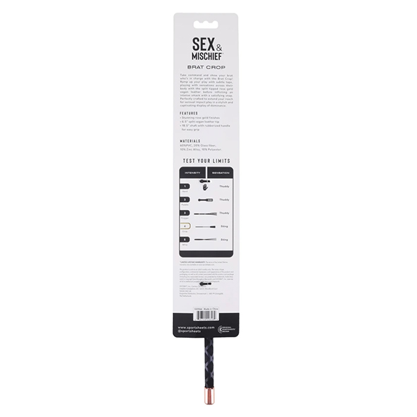 Przejmij dowodzenie i pokaż swojemu bachorowi, kto rządzi w Brat Crop! Zwiększ swoją grę subtelnymi dotknięciami, baw się doznaniami na całym ciele dzięki wegańskiej skórze w kolorze różowego złota, a następnie zadaj intensywne uderzenie satysfakcjonującym trzaskiem.