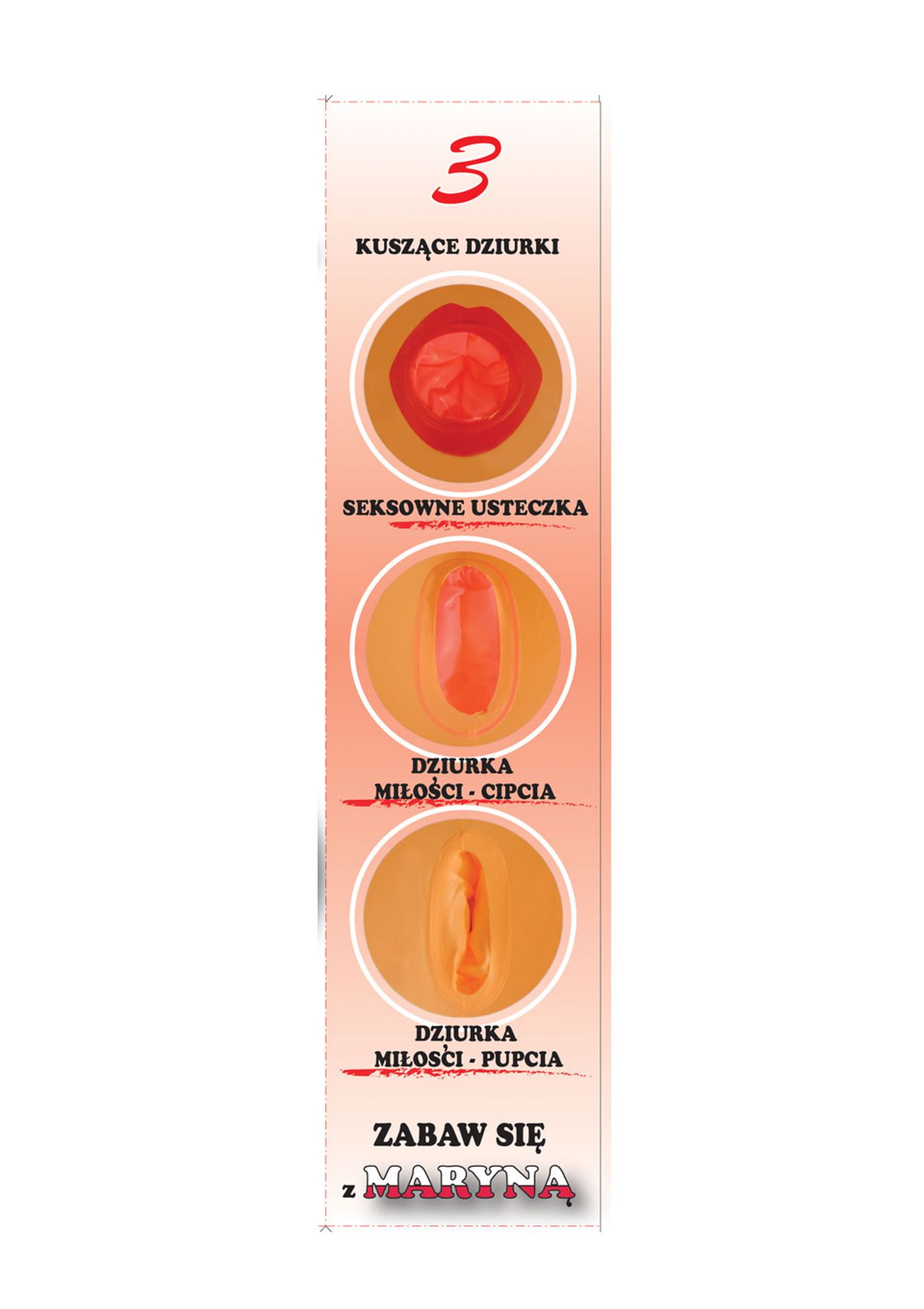 Piękna nadmuchiwana lalka miłości z czarującą nadrukowaną twarzą i stojącą pozycją, która kusi i wzbudza sensację. Jest ona naturalnych rozmiarów, posiada piersi i 3 kuszące dziurki miłosne, w których można umieścić penisa. W celu zapewnienia właściwej higieny, po każdym użyciu przemyć ciepłą wodą z mydłem i/lub zastosować środek do dezynfekcji. Stosować żel poślizgowy na bazie wody. Gadżet świetnie się sprawdzi jako śmieszny prezent na wieczór kawalerski, urodziny lub użyteczny gadżet łatwy do zabrania w każdą podróż służbową :)