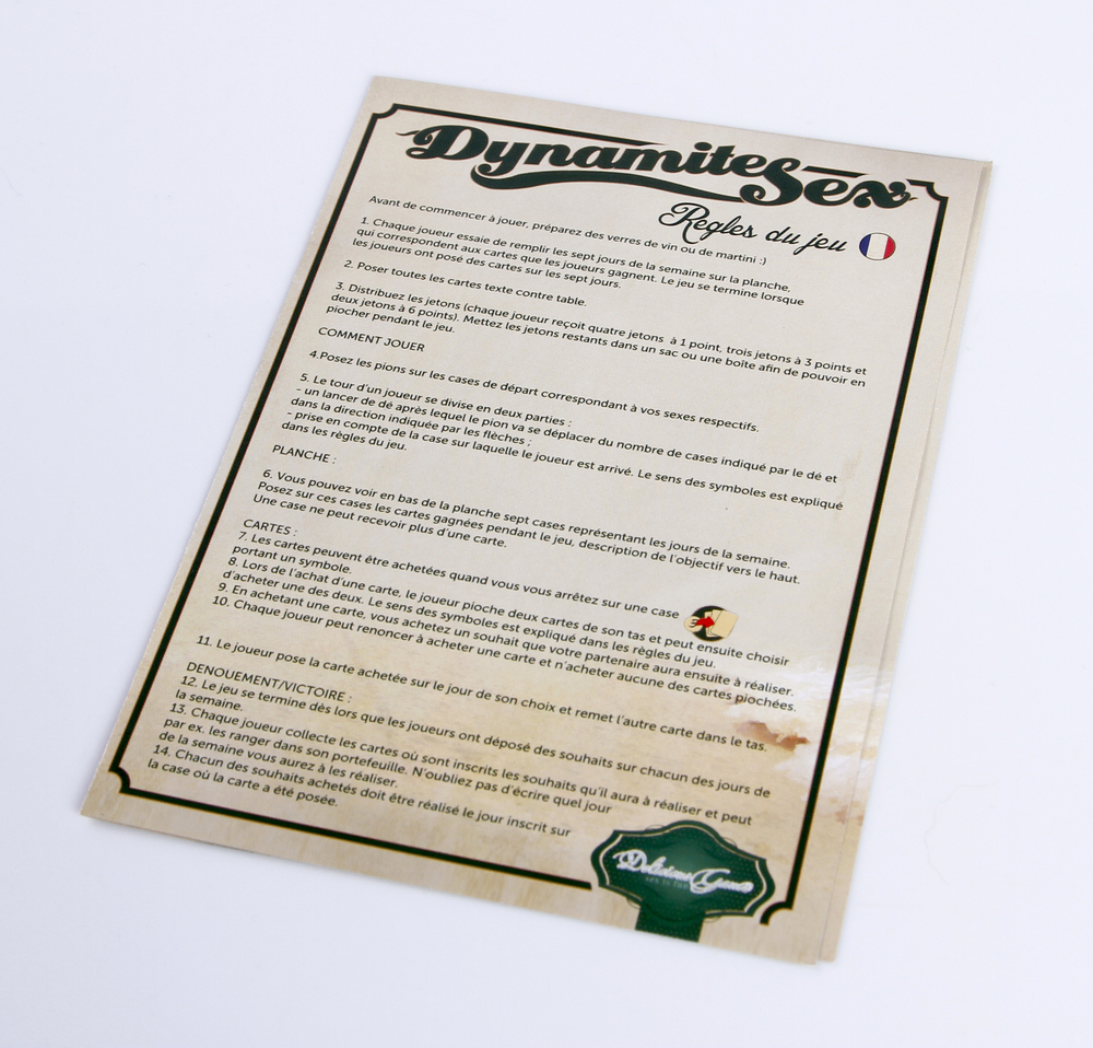 Międzynarodowa gra erotyczna zawierająca instrukcje w językach: polskim, francuskim, angielskim, niemieckim, czeskim, węgierskim oraz rosyjskim.