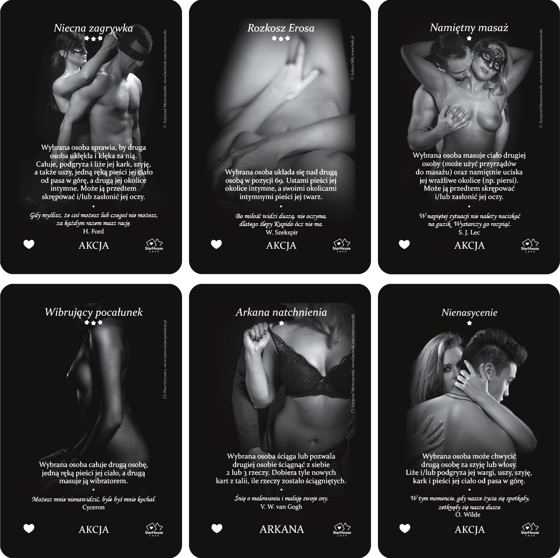 Talia namiętna to idealna okazja, aby podkręcić temperaturę do maksimum. Dzięki niej można otworzyć się na nowe doznania oraz wzmocnić więź, oddając się namiętnym pieszczotom! Talia zawiera aż 55 kart z różnymi zadaniami, wyzwaniami oraz kartami rozbierającymi, które można dowolnie łączyć z talią namiętną i pikantną. Każdą kartę gry zdobi piękna fotografia aktu i inspirujący cytat! Gra ma dwa warianty klasyczny i scenariuszowy, dozujący zmysłowe doznania.