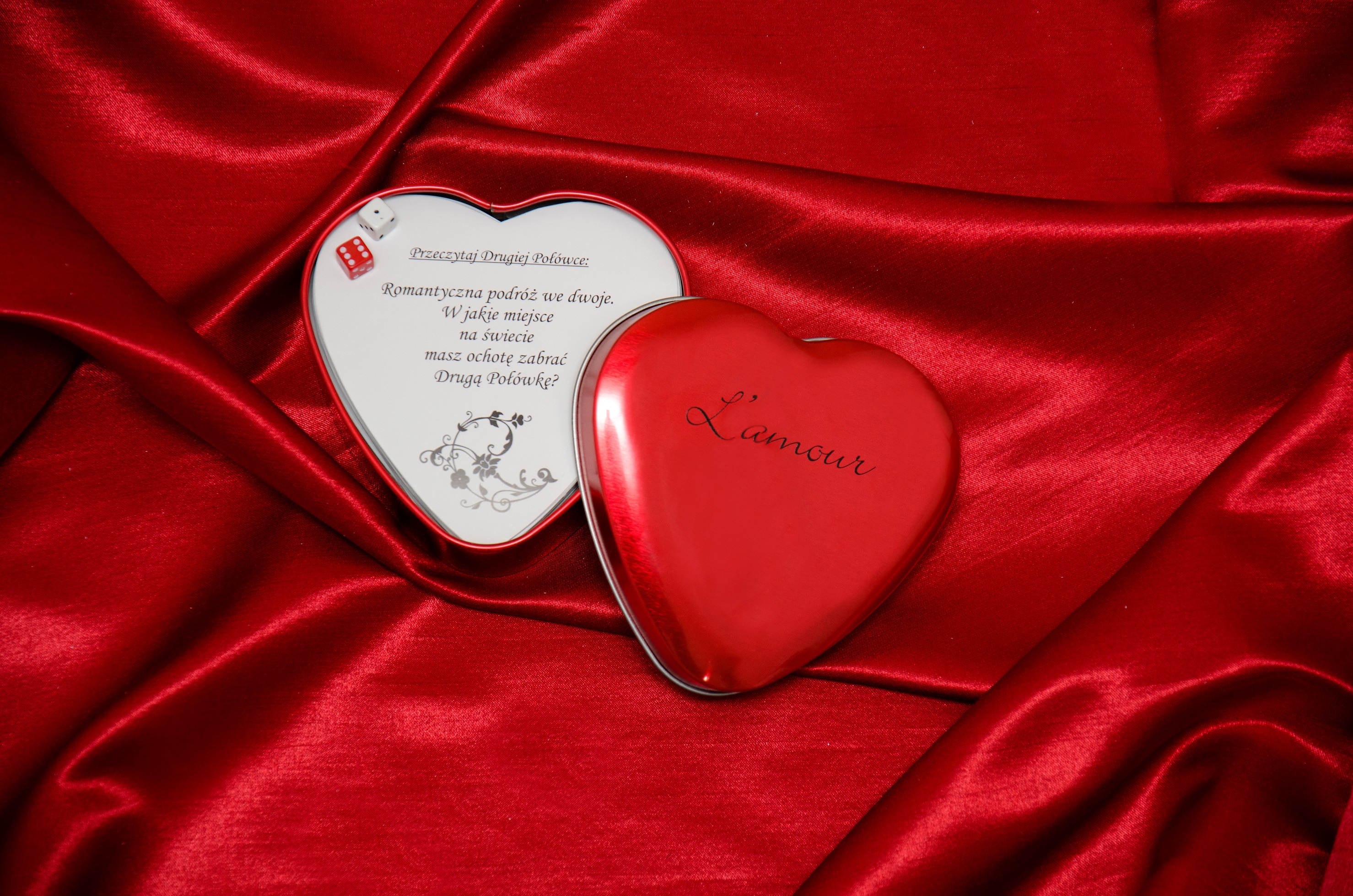 Jest wyjątkowa i romantyczna. Zachwyci Twą Drugą Połówkę oraz Ciebie.L'amour - jest jak esencja miłości. Prześliczne, metalowe pudełeczko - serce,dwie maleńkie kosteczki w kolorze czerwonym oraz perłowym,54 pięknie zdobione karty do gry w kształcie serc,instrukcja.Każde z Was napisze na specjalnym serduszku swoje Sekretne Życzenie. Jednak tylko zwycięzca będzie mógł je zrealizować.Rzucając kostkami, ciągnąc karty i postępując zgodnie z ich treścią, każde z Was będzie kolekcjonować serduszka.