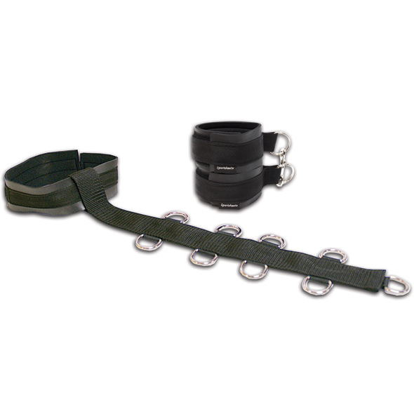 Do obroży przymocowany jest pas ze złączkami. Do nich przypinamy kajdanki, krępując dłonie za plecami albo ewentualnie na brzuchu. Złączek jest na tyle dużo, że możemy próbować różne ustawienia, w zależności jak duży stopnień braku możliwości ruchu chcemy wywołać. Możliwe jest również skucie do pozycji kołyski, skrępowanie zarówno nóg jak i rąk.