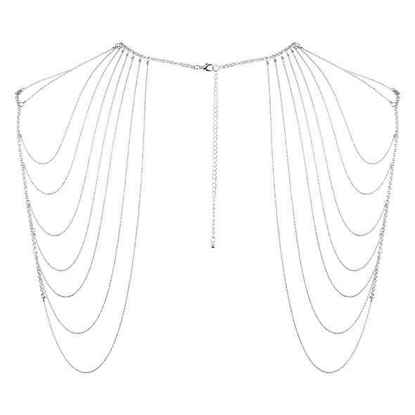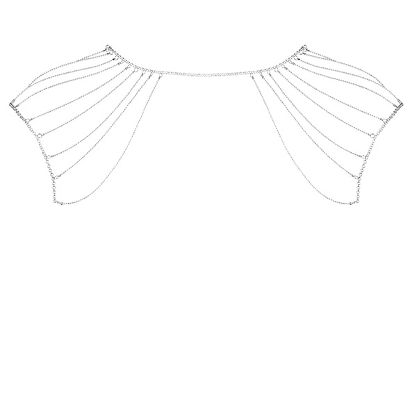Mocno oryginalny dodatek, bardzo atrakcyjny i możliwy do noszenia nie tylko w sypialni. Naramienniki wykonane ze srebrnych łańcuszków otaczają swoją siecią ramiona i żebra. Skutecznie podkreślają zmysłowość kobiecego ciała i komponują się dobrze nie tylko z nagą skórą, ale również ze seksowną bielizną. Nie ma też żadnego problemu, by użyć ich jako ozdoby przy kreacji bardziej oficjalnej, wieczorowej. Na pewno zaskoczą wtedy patrzących, bowiem tego typu dodatki są ciężkie do kupienia. Wzorców dla nich można doszukiwać się tancerkach kabaretowych, ale też w dużo wcześniejszych wiekach, gdzie kobiety możne i wysokiego stanu nie stroniły od przepychu, sięgając często właśnie po misternie plecione łańcuszki.