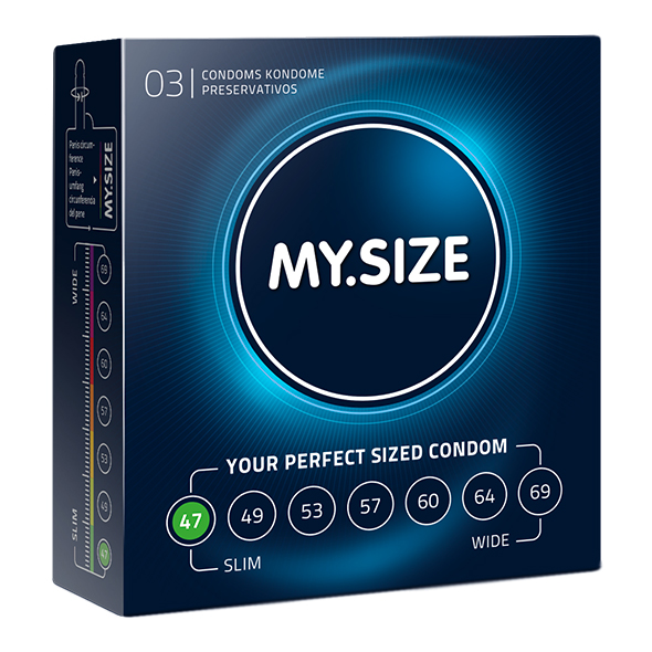 Ideą firmy My Size jest dostarczenie mężczyznom prezerwatyw maksymalnie dopasowanych do ich anatomii. Ponieważ te standardowe są najczęściej zbyt wąskie lub zbyt szerokie, to My Size proponuje nam kondomy w siedmiu rozmiarach, od 47 do 69mm średnicy. Takie idealne dopasowanie daje użytkownikowi jak najbardziej naturalne doznania podczas stosunku. Koniec już z gumkami zbyt luźnymi, mającymi tendencję do rolowania się, albo zbyt ciasnymi, pozbawiającymi penisa tchu i wywołującymi dyskomfort podczas penetracji.