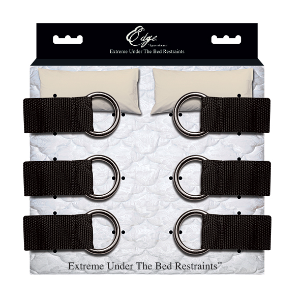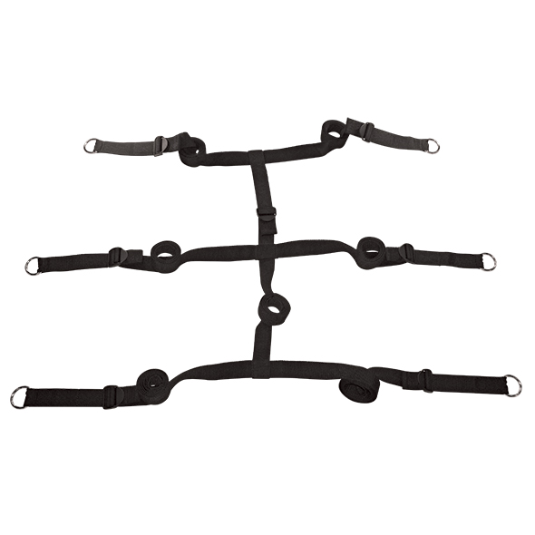 Idea jest taka, że przewlekamy długi, pionowy pas pod materacem łóżka (ewentualnie za drzwiami), natomiast pasy poziome tworzą sieć punktów do których można drugą osobę przykuć czy przywiązać. Te właśnie zakończone są klasycznymi kółkami stalowymi (o-ringami) więc bez problemu dają się łączyć ze sznurami, pasami, kajdankami, smyczami i tego typu akcesoriami.