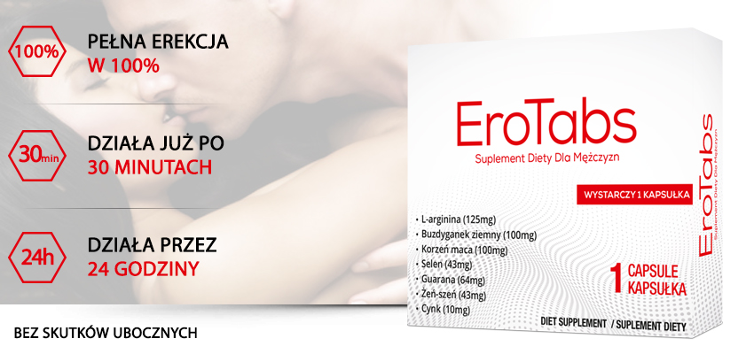 Dzięki działaniu EroTabs zobaczysz jak łatwo osiągniąć prawdziwą erekcję! Stosowanie suplementu diety jest bardzo proste, wystarczy na około 30 minut przed stosunkiem połknąć kapsułkę i popić dużą ilością wody. Doświadczysz erekcji, którą bez problemu, wywołasz za każdym razem kiedy będziesz chciał! I to aż przez 24 godziny, dzięki temu osiągasz niespotykaną możliwość odbywania kilku stosunków jednej nocy!