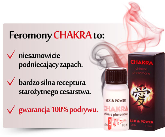 Nie ryzykuj, kupując tanie feromony dostępne na polskim rynku. Kup pewność i sprawdzoną recepturę w oryginalnej butelce. Z Chakrą masz gwarancję sukcesu, potwierdzoną przez naszych licznych zadowolonych Klientów.