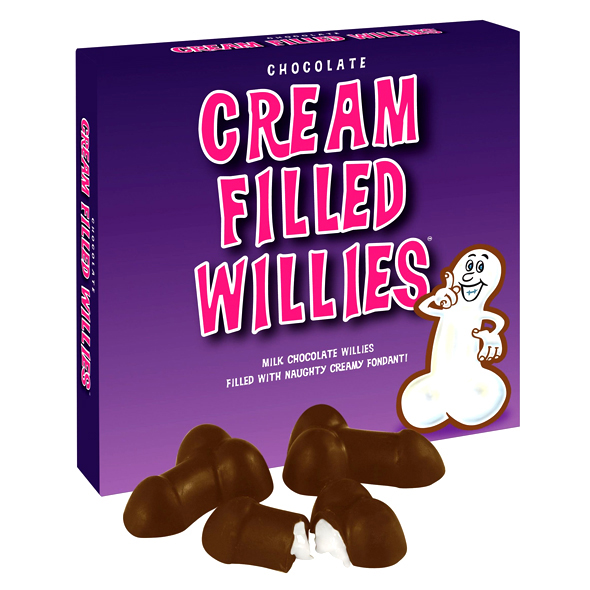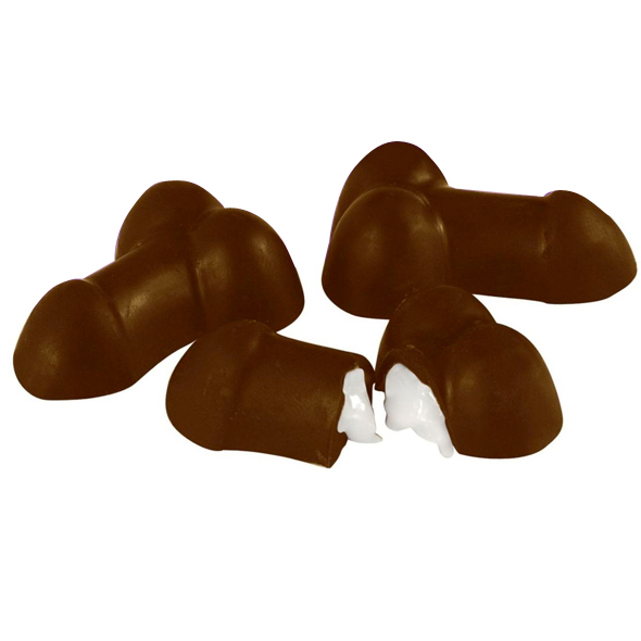Czekoladki w kształcie męskiego interesu, wykonane z czekolady mlecznej. W środku znajduje się biały, słodki krem.