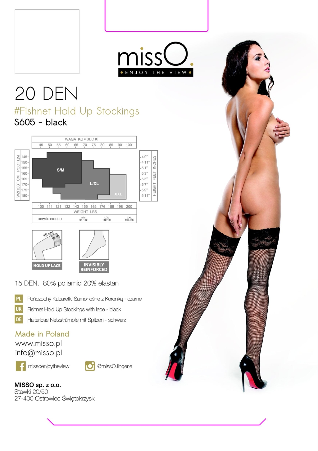 Pończochy samonośne, z szeroką, ozdobną koronką na górze. Fason to kabaretki – wykonane są z oczek dość małych. Można je bez problemu łączyć z ubiorami o szerokim przekroju stylistycznym, niekoniecznie ograniczać tylko do zestawień z bielizną i wieczorów we dwoje.