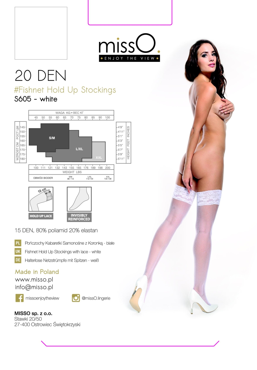 Pończochy samonośne, z szeroką, ozdobną koronką na górze. Fason to kabaretki – wykonane są z oczek dość małych. Można je bez problemu łączyć z ubiorami o szerokim przekroju stylistycznym, niekoniecznie ograniczać tylko do zestawień z bielizną i wieczorów we dwoje.