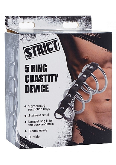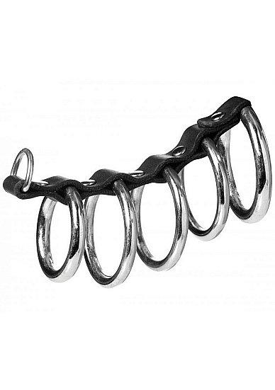 Ściśnij penisa i kulki uległego w pierścień podstawy i przesuń go przez pozostałe cztery pierścienie.
