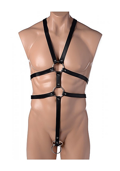 Trzy regulowane paski zapewniają, że ten seksowny dodatek bondage pasuje do większości męskich ciał, z dwoma pierścieniami,