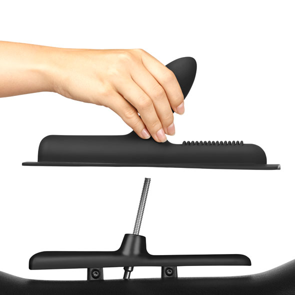 Na grzbiecie siedziska znajduje się nakładka stymulująca. W komplecie są dwie wersje – jedna jest prawie płaska, pokryta tylko siecią wyraźnych silikonowych wypustek oraz wybrzuszeniem o który może ocierać się łechtaczka. Służy właśnie do intensywnej stymulacji klitorisu, wzgórka łonowego, warg sromowych, wejścia do pochwy – nie nadaje się natomiast do penetracji. Do tego zaś służy druga nakładka. Ma ona mocnego penisa – z wierzchu silikonowego, w środku usztywnionego, by był w stanie wytrzymać dzikie harce kobiety. Obok niego zaś znajdują się również wypustki by podczas penetracji można było wybrać pozycję, w której stymulowana jest również łechtaczka.