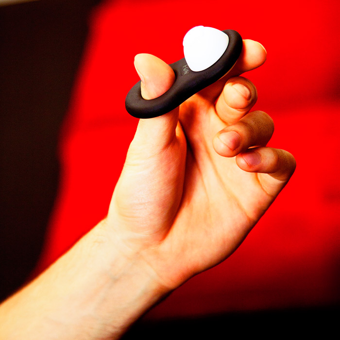 Wygodna rączka z otworem na palec pozwala na swobodne używanie masturbatora w każdej pozycji. Również podczas seksu, gdy ściśnięty waszymi ciałami będzie pieścił oboje, śląc wibracje w najbardziej wrażliwe miejsca.