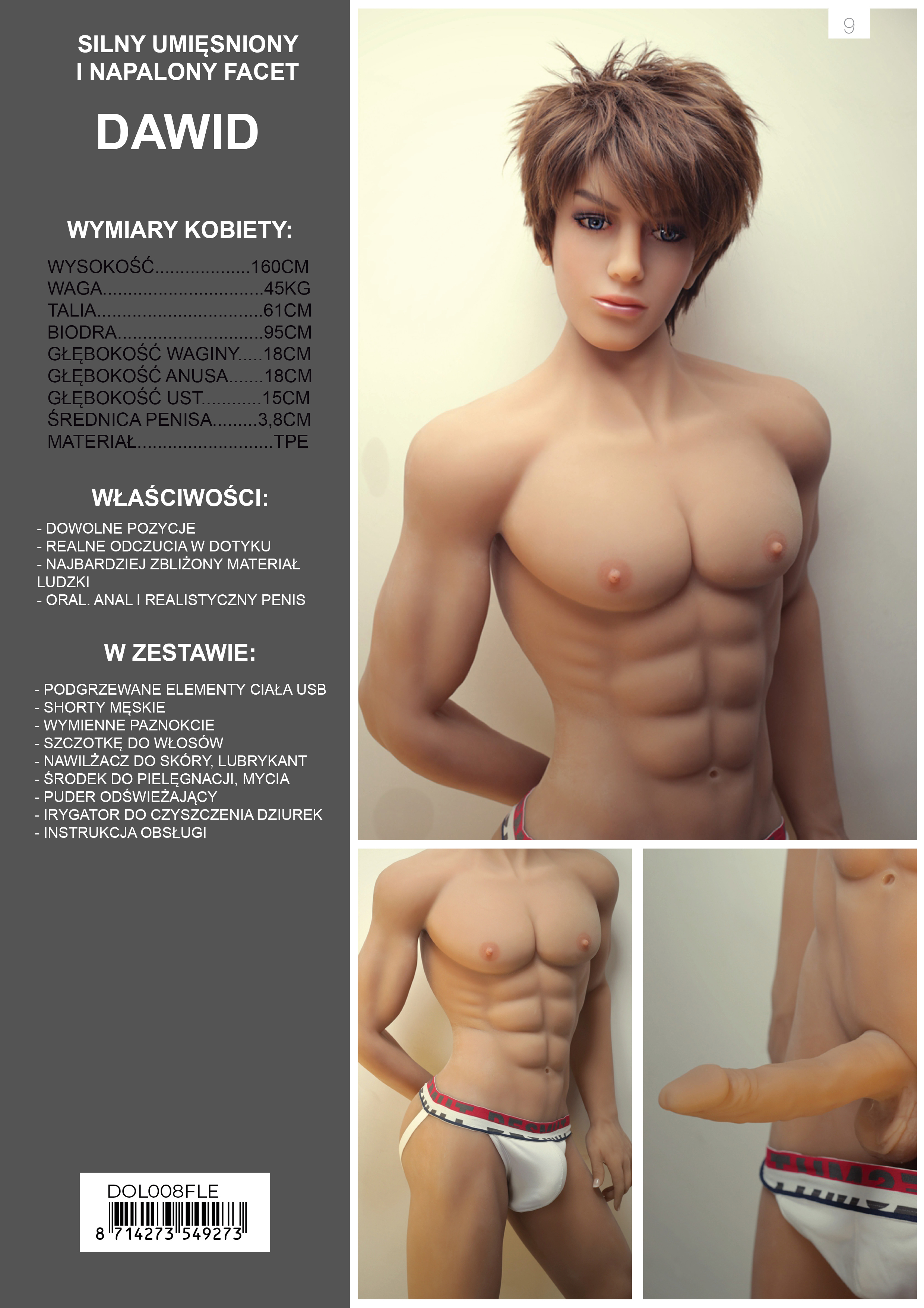 Dawid to swobodnie stojąca lalka wykonana z bezpiecznego dla ciała materiału TPE (najwyższej jakości materiał przypominający do złudzenia ludzką skórę i mięśnie).