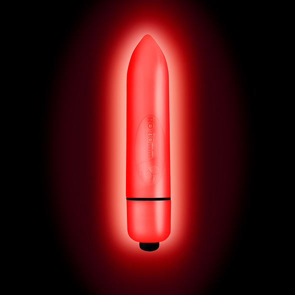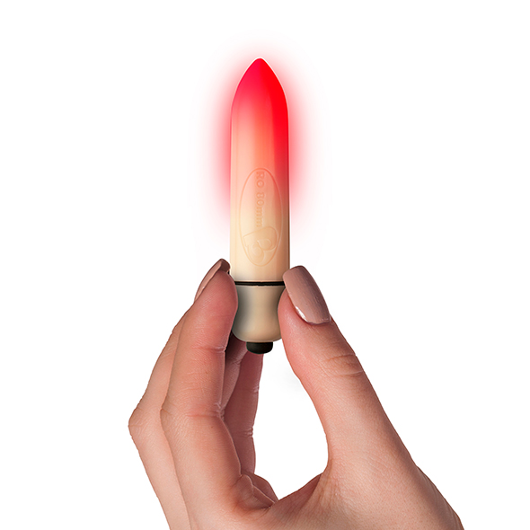 Jeśli chodzi o sam wibrator, to bazuje on na jednym z najpopularniejszych modeli od Rocks-Off, czyli wzorze RO 80mm. Niedużym, kompaktowym, mającym kształt pocisku. Nadaje się do płytkiej penetracji – z racji swojej długości – ale nadzwyczaj sprawnie odnajduje się w stymulacji łechtaczki. Ta, dokonywana całą powierzchnią lub bardziej precyzyjnie – zwężonym czubkiem – jest pełna wrażeń. Zasługa w tym aż siedmiu programów pracy. Czyli mimo niewielkiego rozmiaru wibrator sporo potrafi i będzie ciekawym towarzyszem zabaw solo lub gry wstępnej. A kolorowa poświata doda im smaczku i niepowtarzalnego nastroju.