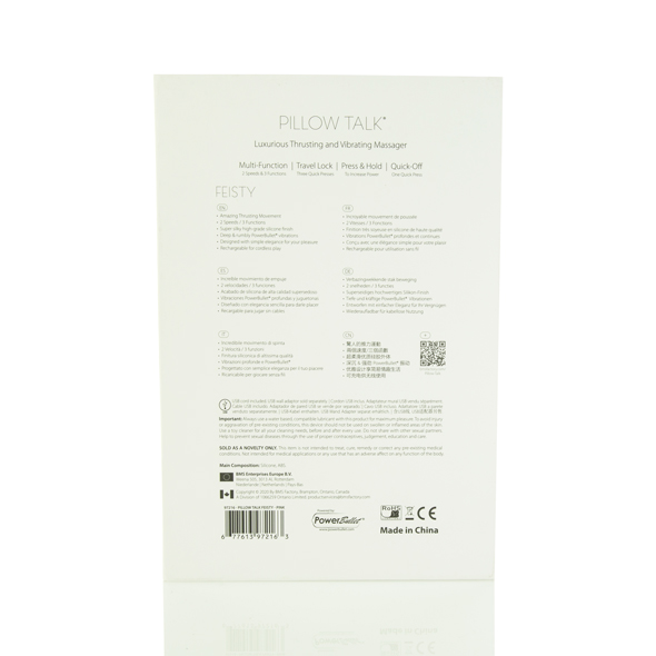 Mamy to więc wibrator, który naśladuje męskie ruchu, pracując w trybie „pchającym”, posuwistym. Feisty wyposażono w 2 prędkości i 3 dynamiczne programu wibracji. Czubek stanowi apetyczna główka, pokryta mięciutkim i miłym w dotyku silikonem. Rękojeść duża, pozwalająca na wygodny chwyt, a całość zamknięta w stylowym opakowaniu – no i oczywiście ozdobiona kryształkiem Swarovskiego, by uczynić ten model jeszcze bardziej kobiecym i eleganckim.