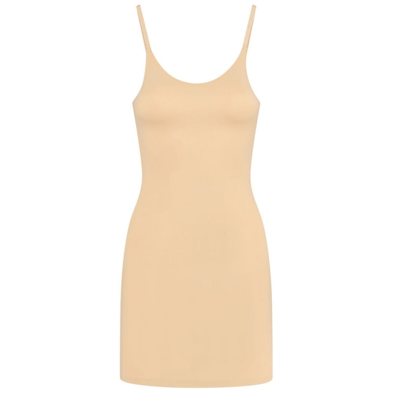 Beżowa gładka sukienka na cienkich, regulowanych ramiączkach o dopasowanym fasonie i okrągłym dekolcie.