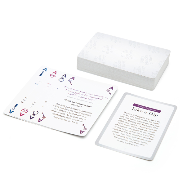 Z takim podejściem powstał projekt kart inspirowanych dirty talk i światem BDSM w wykonaniu Any i Greya. Karty podobne są do klasycznej talii, kolorami jednak są klucz, krawat, kluczy i pierścień. Na kartach znajdują się sugestie, polecenia i przykłady, jak można mówić brzydko, by było to podniecające dla partnera/partnerki. W każdej grze możecie uczyć się, by takie słownictwo i zachowania wprowadzać do waszej codziennej aktywności erotycznej. Jeśli więc chcecie umieć świntuszyć, to możecie nauczyć się tego z Christianem i Aną.