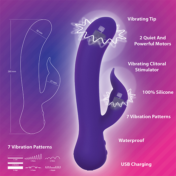 Wyposażono go 2 silniki, osobno do stymulacji punktu G i waginy i osobno do masażera łechtaczki. Wibracje są więc wyraźnie odczuwane, mocno stymulujące, trafiające od razu w odpowiednie miejsca.