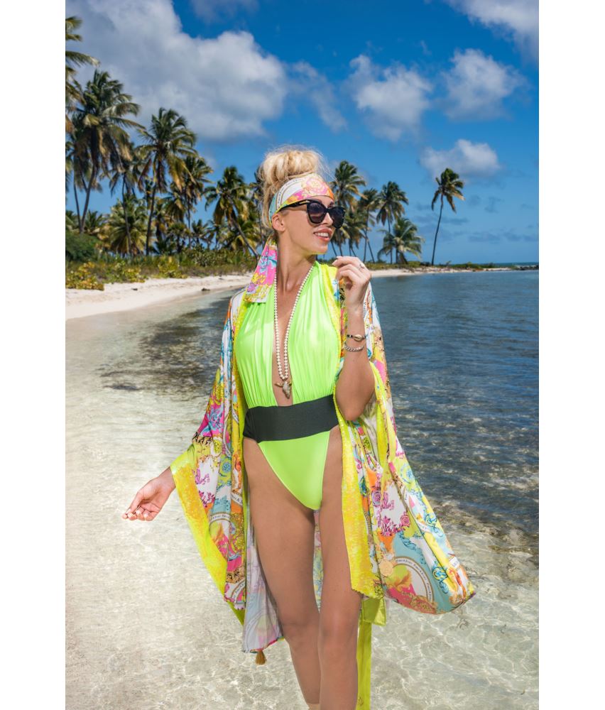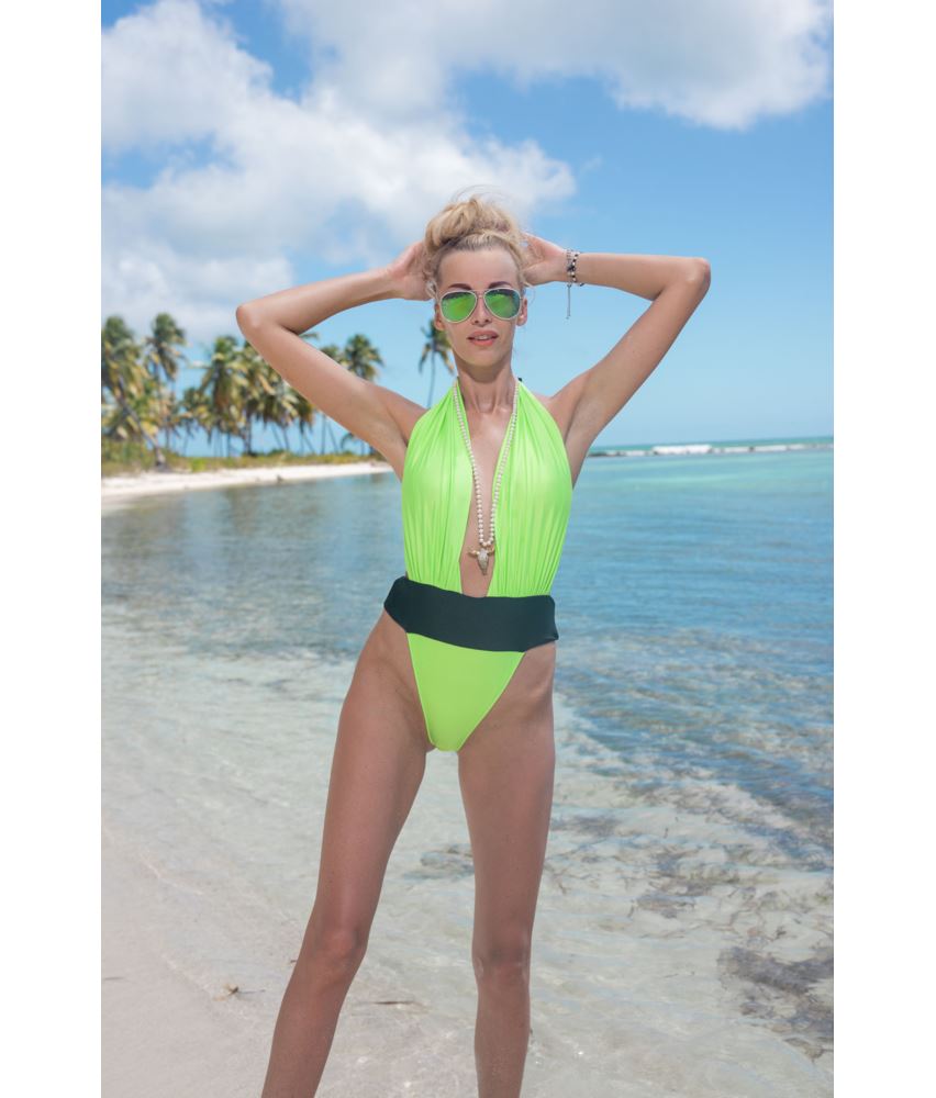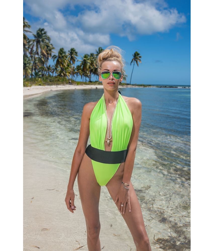 Efektowny, jednoczęściowy kostium plażowy, w kolorze neonowej zieleni, który zachwycapod każdym względem. Dekolt typu ,,V"