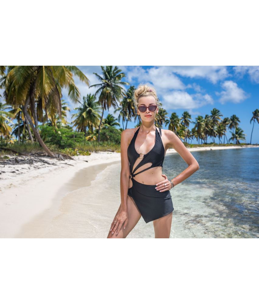 Odważna a zarazem niesamowicie seksowna plażowa sukienka w kolorze czarnym, z asymetrycznymi wycięciami połączona ozdobnymi kółkami, która nieziemsko prezentuje się na kobiecej sylwetce. Nada seksapilu a zarazem wygody na plaży.