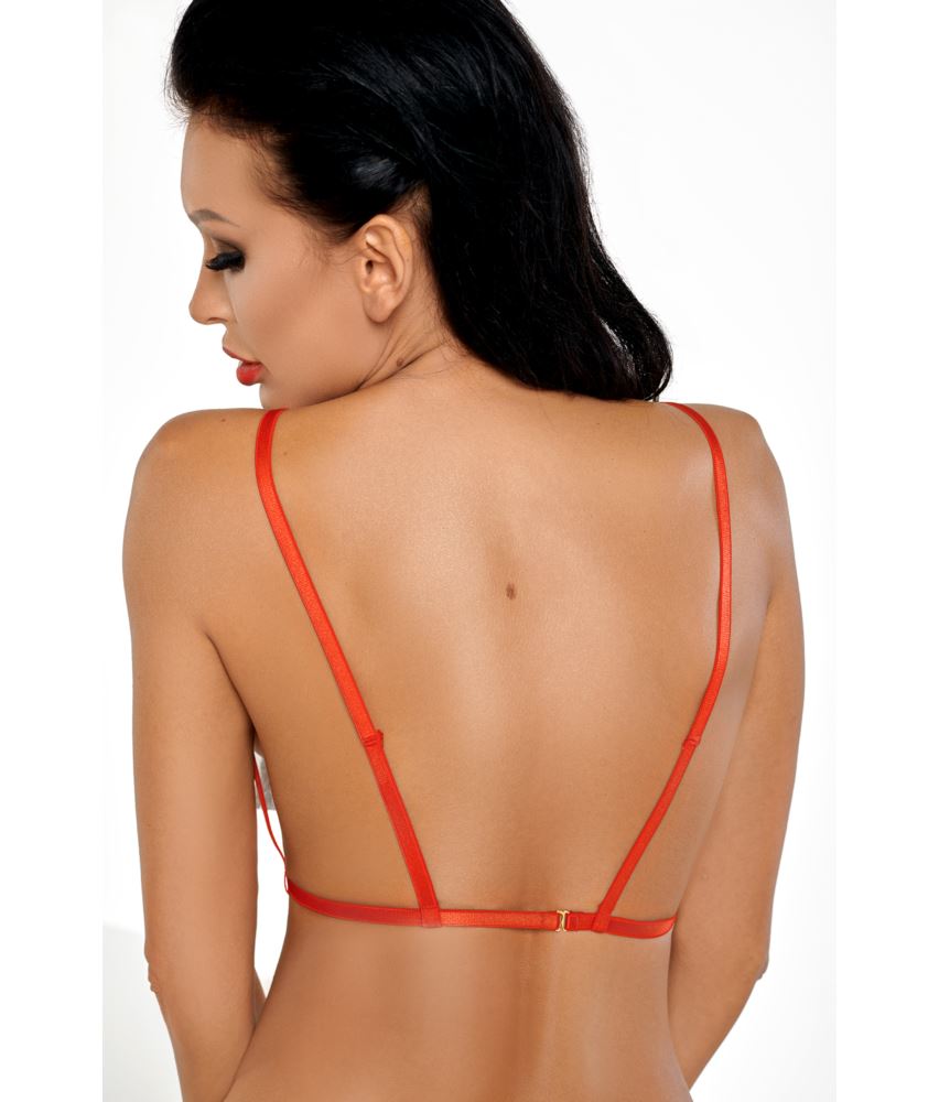 Ciekawe połączenie skórzanych łatek, srebrnych ćwieków oraz gumy. Nieco przewrotny w swym charakterze harness zakrywa dekolt, ale pozostawia biust odsłonięty. Model dostępny w kolorze czarnym i czerwonym.