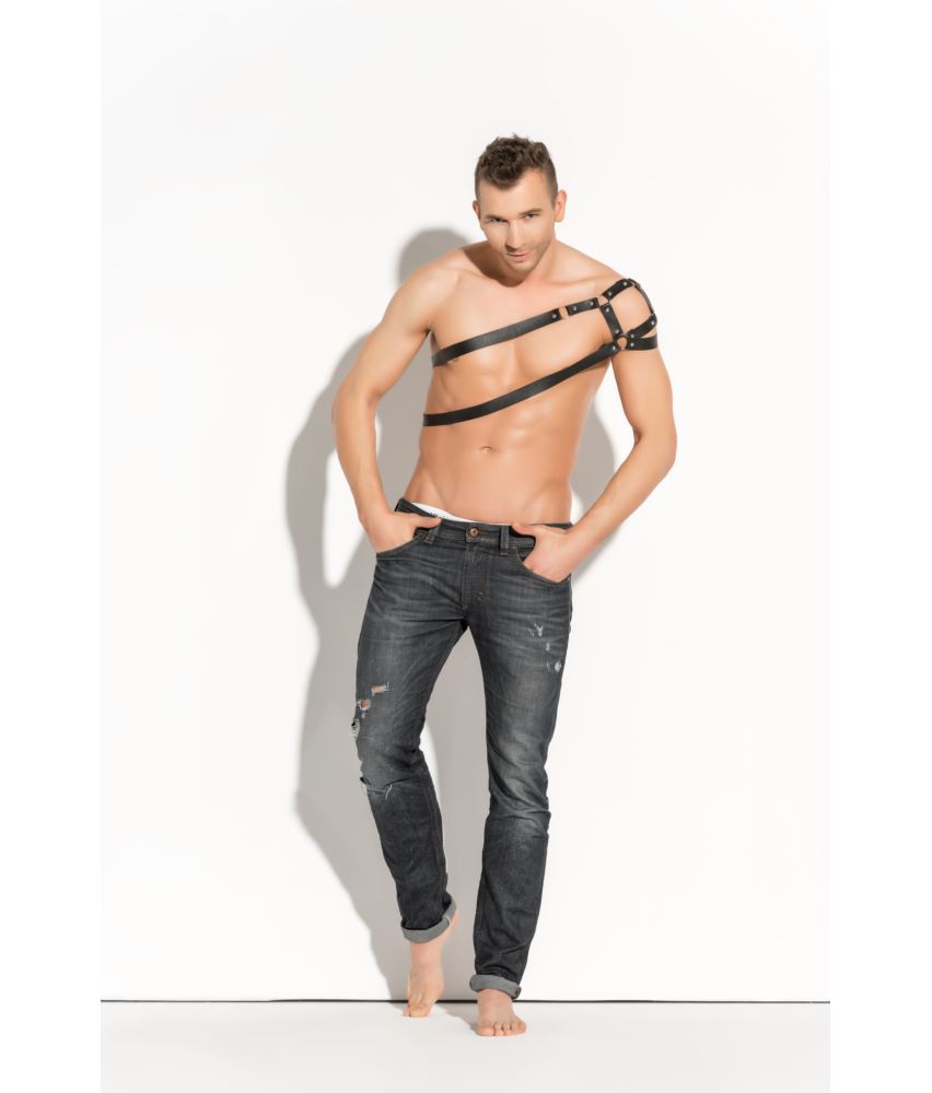 Męski Harness przez jedno ramię, ze srebrnymi dodatkami. Model dostępny w kolorze czarnym. Zapakowane w eleganckie pudełeczko.