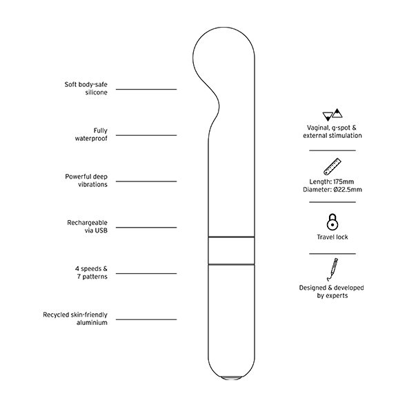 Rozmiary wibratora są bardzo poręczne. Chociaż nie jest duży, to dzięki wyprofilowanej główce jest w stanie pieścić punkt G bardzo intensywnie. Na niej koncentruje się praca silnika, który oferuje 4 prędkości i 7 trybów wibracji. Dodajmy, że są to tzw. wibracje rumbly, czyli dudniące, głębokie. Wiele kobiet uważa, że właśnie taki ich rodzaj najlepiej sprawdza się przy stymulacji punktu G, który lubi stanowczość i mocny nacisk. W ten sposób zresztą można nie tylko doprowadzić się do potężnego orgazmu, ale również przeżyć squirt, który zwykle wymaga właśnie mocnego pobudzenia punktu G. Oczywiście nic nie stoi na przeszkodzie, by krągłej główki używać również do pieszczot łechtaczki. Będzie tym zachwycona.