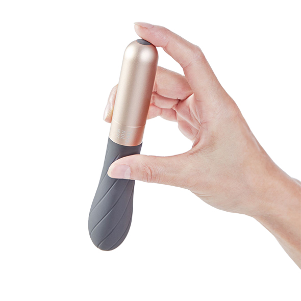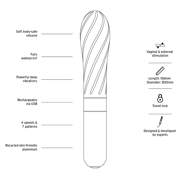 Masażer jest elegancki, łączy w sobie minimalizm z wysoką jakością wykonania i świetnymi parametrami technicznymi. Silikonowa główka jest krągła, poznaczona nierównościami dla większej przyjemności – ale też dla lżejszego wizualnie wyglądu.