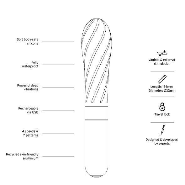 Masażer jest elegancki, łączy w sobie minimalizm z wysoką jakością wykonania i świetnymi parametrami technicznymi. Silikonowa główka jest krągła, poznaczona nierównościami dla większej przyjemności – ale też dla lżejszego wizualnie wyglądu.