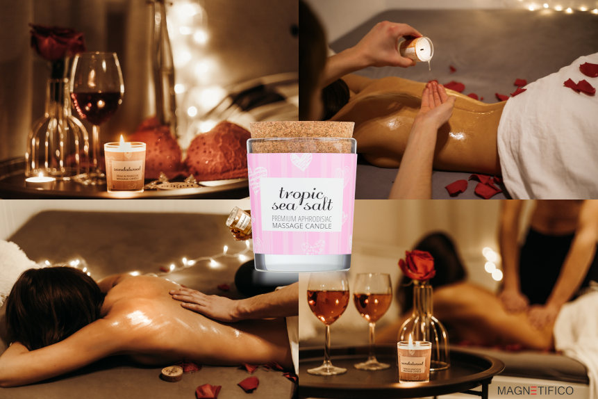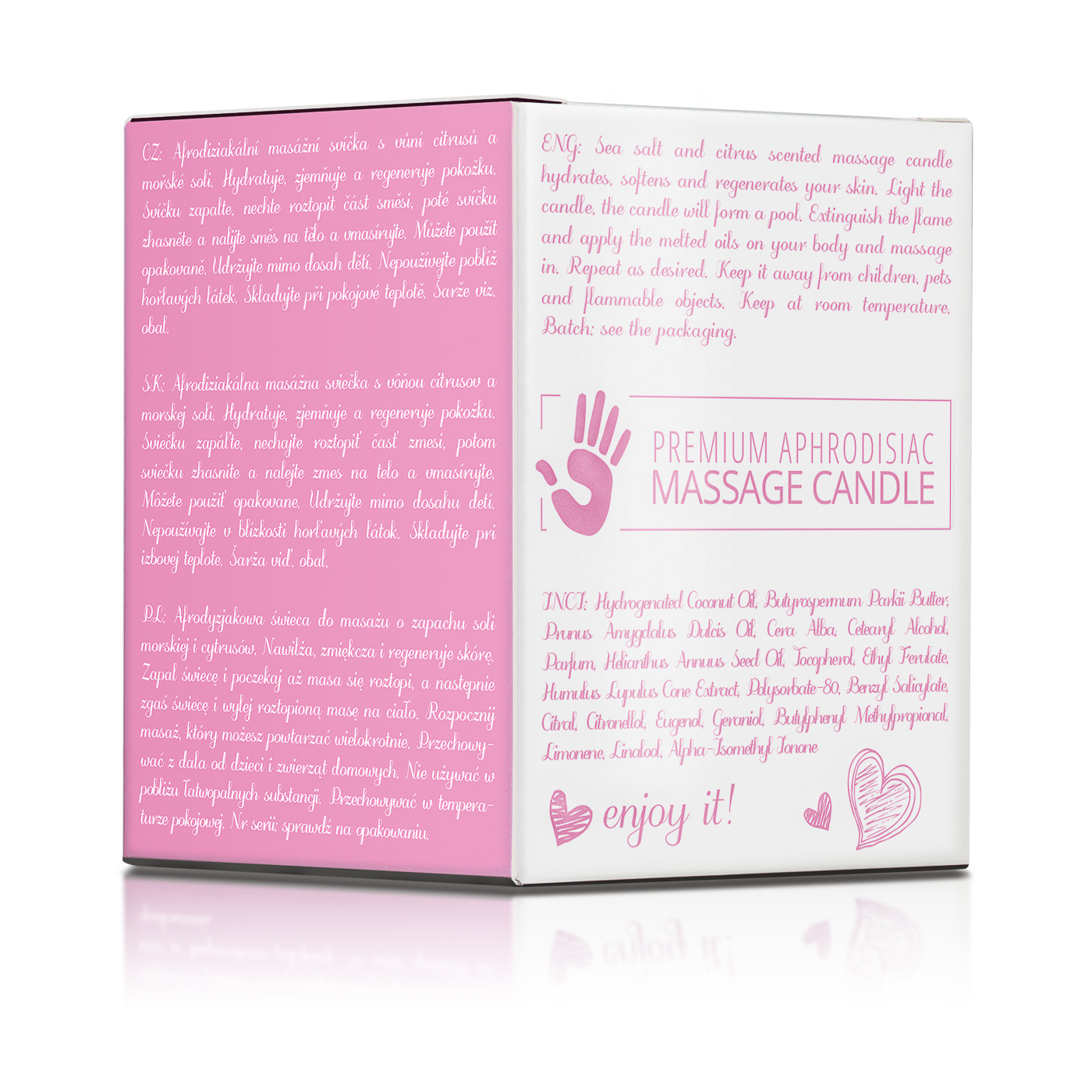 Jest to świeca typu 3w1 stworzona z myślą o masażu całego ciała. Zawiera wyselekcjonowane pod tym kątem składniki m.in. masło shea, olejek kokosowy, wosk pszczeli i przeciwutleniacze, które po zapaleniu świecy rozpuszczają się tworząc w ciągu kilku minut olejek do masażu, który można następnie rozprowadzić po ciele partnera w celu wykonania niezapomnianego aromatycznego masażu. Składniki zawarte w formule olejku dodatkowo nawilżają, odżywiają i regenerują skórę - pozostawiając ją miękką w dotyku i otuloną zmysłowym zapachem feromonów zwiększając przyjemność ze wspólnie spędzonych chwil.
