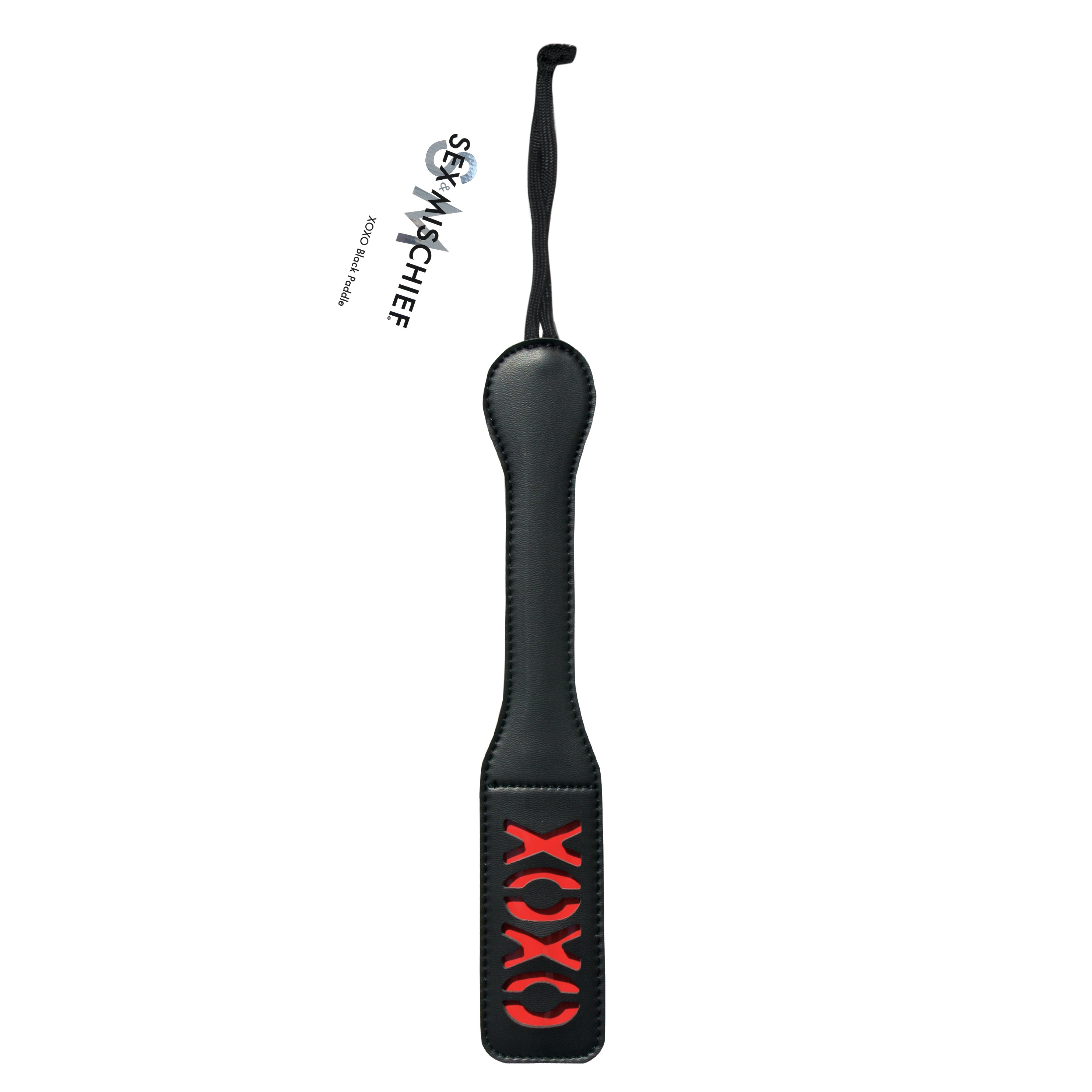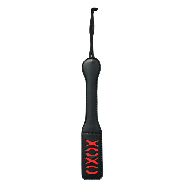 Czarna winylowa packa do dawania klapsów posiada wzór XOXO, dzięki czemu jest jednocześnie efektowna i stylowa.