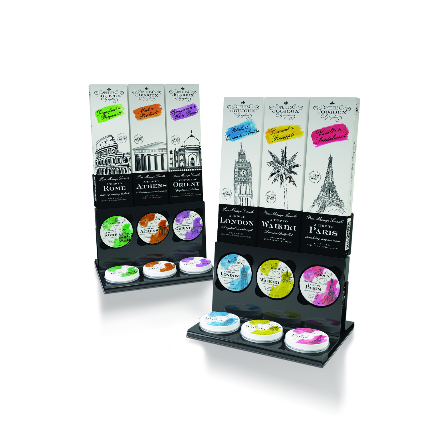 Nasze świece do masażu Petits Joujoux fine to prawdziwa podróż dla zmysłów: Delikatnie pachnący wosk roztapia się w ciepły i odżywczy olejek do masażu z masła Shea i Jojoba, aż zapach przeniesie Ciebie i Twojego kochanka do odległych snów w obcych krajach... Nasze 6 najbardziej ukochane zapachy są teraz dostępne w mniejszym rozmiarze. Zapakowane w starannie zaprojektowany blaszany słoiczek, można je kupować na sztuki, w zestawie po 5 sztuk lub w naszych nowych ekspozytorach, które zawierają próbki dla klientów, aby mogli wypróbować swoje ulubione zapachy.