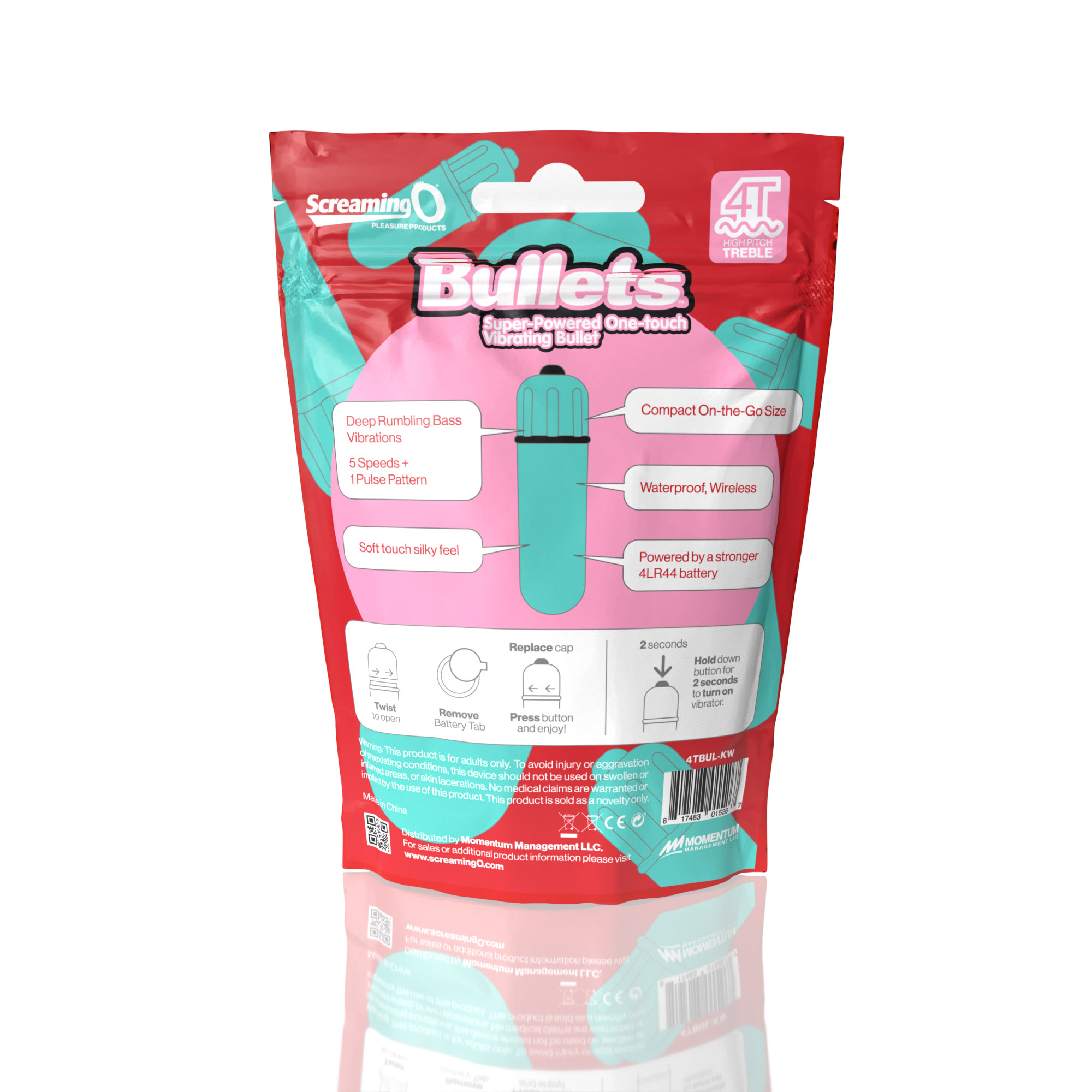 Screaming O 4T Bullets to najlepsze wibracje w każdym miejscu dzięki potężnemu silnikowi wibracyjnemu 4T w stylu wysokich tonów; nowe, trwalsze baterie 4LR44; i zwarty kształt. Oprócz wodoodporności, wibrujące pociski uruchamiane jednym dotknięciem są wyposażone w mocny, ale cichy silnik, który zapewnia niezbędną stymulację dla lepszego, bardziej satysfakcjonującego seksu!