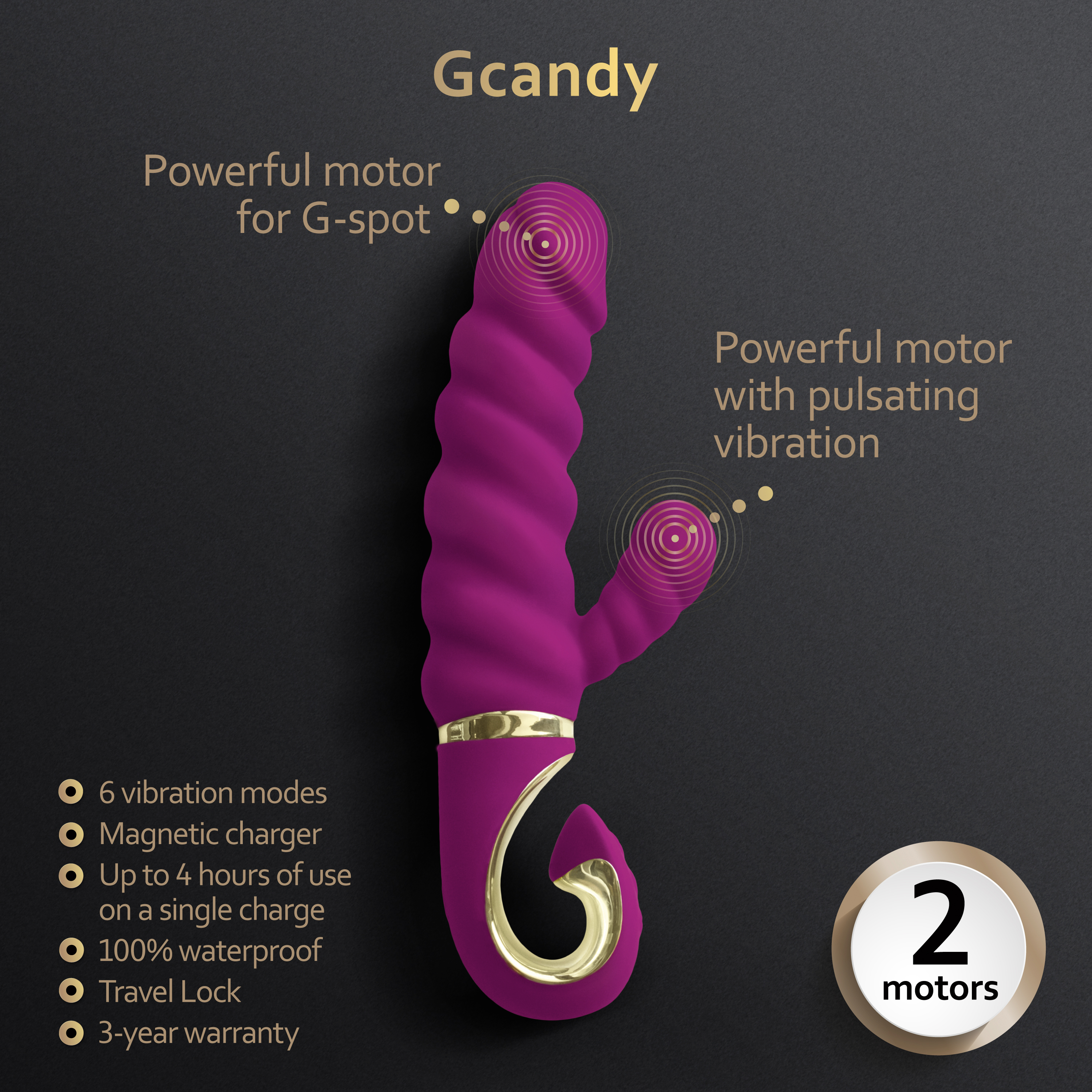 Może pochwalić się 2 mocnymi silniczkami, z czego jeden znajduje się w tułowiu na końcu, aby stymulować punkt G, a drugi w palcu, aby stymulować łechtaczkę. Czas działania Gcandy na jednym ładowaniu wynosi nie mniej niż 4 godziny.