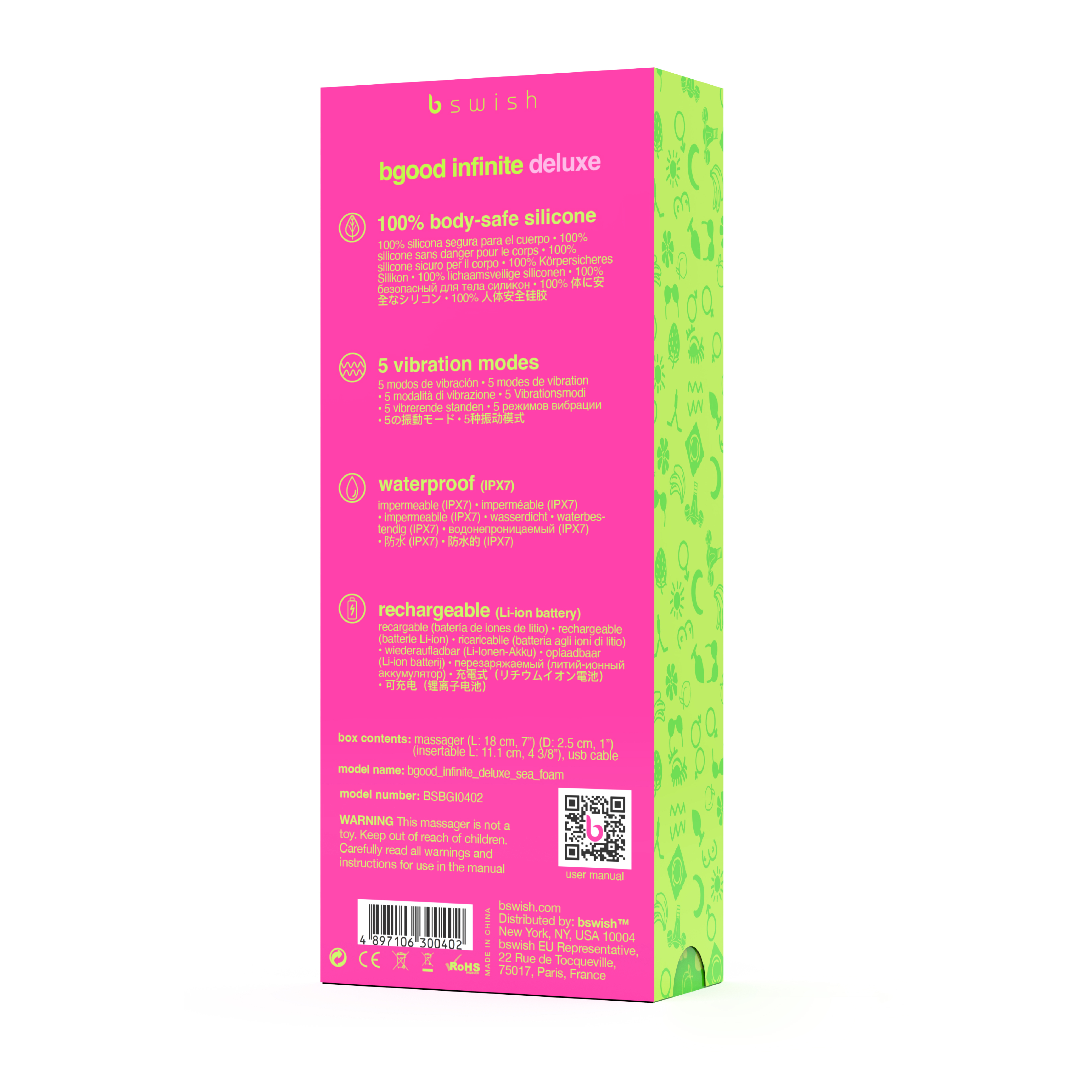Rozpocznij więc przygodę od wodoodpornej konstrukcji z możliwością ładowania, która zaprosi Cię do kreatywnych eskapad i doświadczenia czystego błogiego podniecenia. bdobry dla siebie i wejdź do świata dekadencji i pożądania z bgood nieskończonym luksusem – uosobieniem współczesnej zmysłowości.