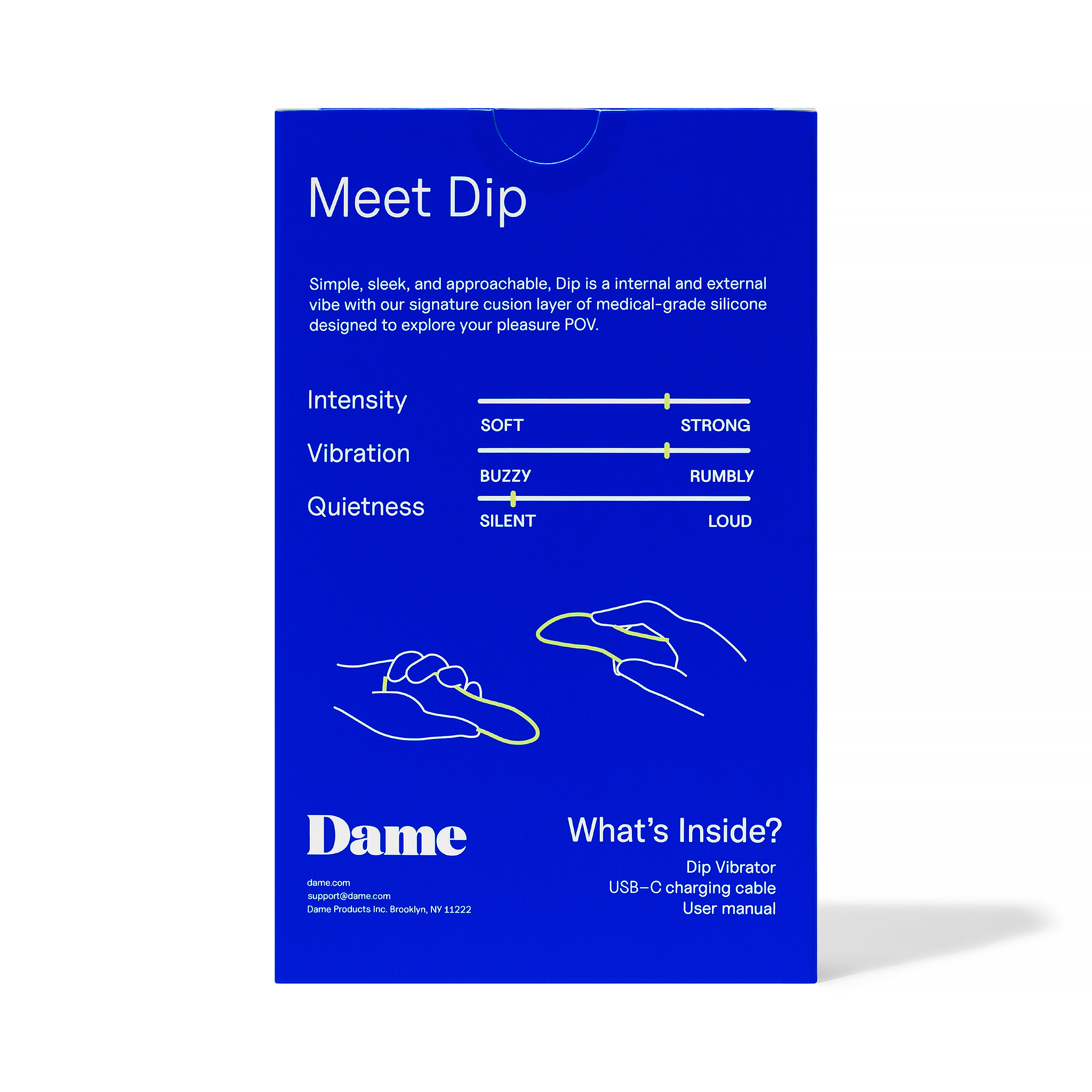 Przed użyciem w pełni naładuj Dip. Dip ma jeden przycisk do zasilania i intensywności. Wyczyść wibrator po każdym użyciu, używając mydła i wody lub środka czyszczącego do zabawek erotycznych, takiego jak Dame's Hand + Vibe Cleaner. Jeśli używasz środka czyszczącego na bazie alkoholu, odczekaj kilka sekund, aż alkohol wyparuje przed użyciem zabawki. Dokładnie osusz.