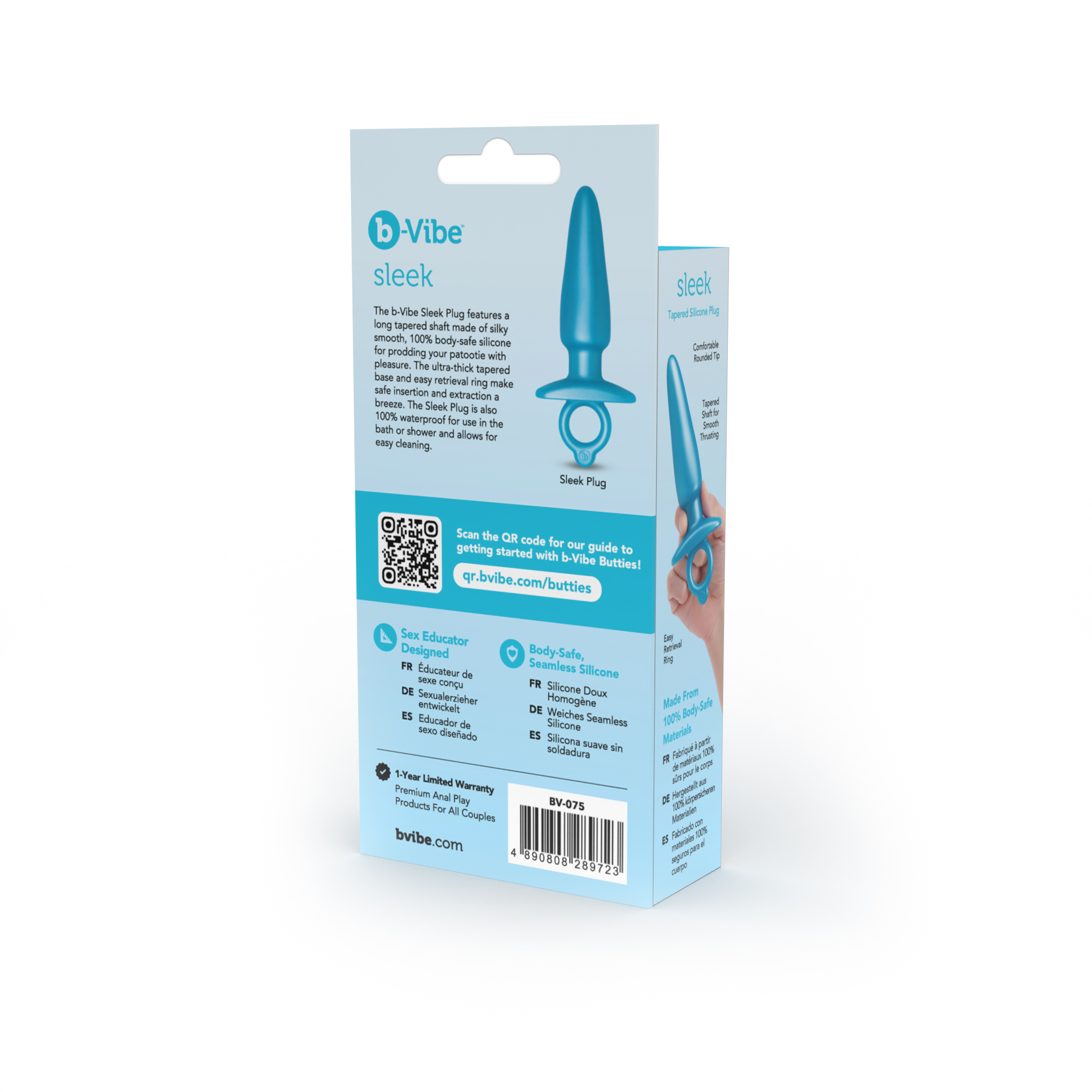 Wtyczka b-Vibe Sleek Plug ma długi stożkowy trzon wykonany z jedwabiście gładkiego, w 100% bezpiecznego dla ciała silikonu, który pozwala na przyjemne dotykanie pazura.