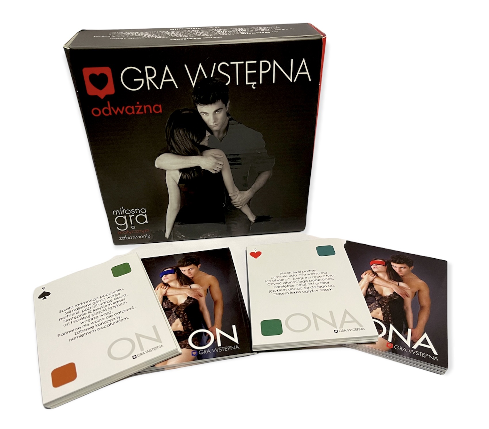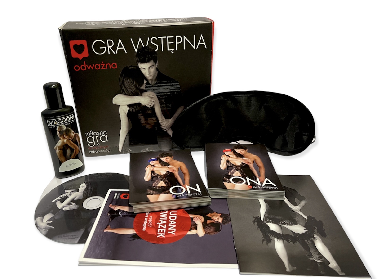 Gra wstępna to kilkuelementowy zestaw wprowadzający w krainę rozkoszy. Podstawa to, aż 54 karty z opisem mniejszych i większych przyjemności. Jednak to nie wszystko. Otrzymacie również opaskę na oczy, która pozwoli Wam skupić się jeszcze mocniej na cielesnych doznaniach. Z kolei pachnący olejek do masażu sprawi, że każde muśnięcie skóry będzie jeszcze przyjemniejsze.